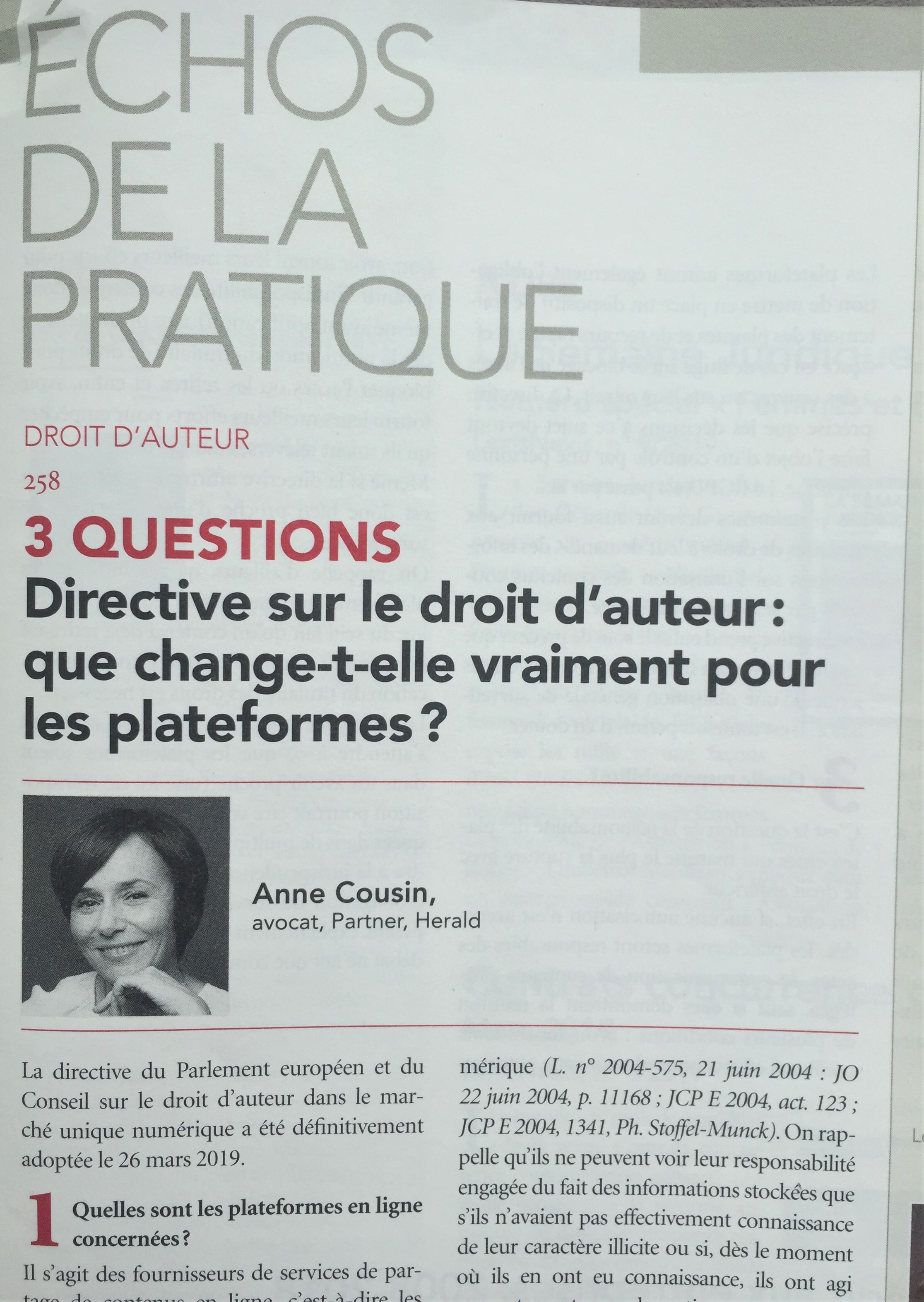 Anne Cousin analyse l'impact, pour les plateformes en ligne, de la directive sur le droit d'auteur. Read More